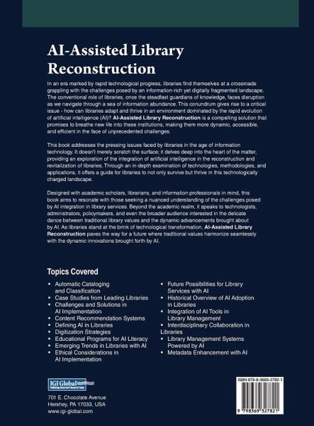 In an era marked by rapid technological progress, libraries find themselves at a crossroads grappling with the challenges posed by an information-rich yet digitally fragmented landscape. The conventional role of libraries, once the steadfast guardians of knowledge, faces disruption as we navigate through a sea of information abundance. This conundrum gives rise to a critical issue - how can libraries adapt and thrive in an environment dominated by the rapid evolution of artificial intelligence (AI)? AI-Assisted Library Reconstruction is a compelling solution that promises to breathe new life into these institutions, making them more dynamic, accessible, and efficient in the face of unprecedented challenges. This book addresses the pressing issues faced by libraries in the age of information technology. It doesn't merely scratch the surface; it delves deep into the heart of the matter, providing an exploration of the integration of artificial intelligence in the reconstruction and revitalization of libraries. Through an in-depth examination of technologies, methodologies, and applications, it offers a guide for libraries to not only survive but thrive in this technologically charged landscape.