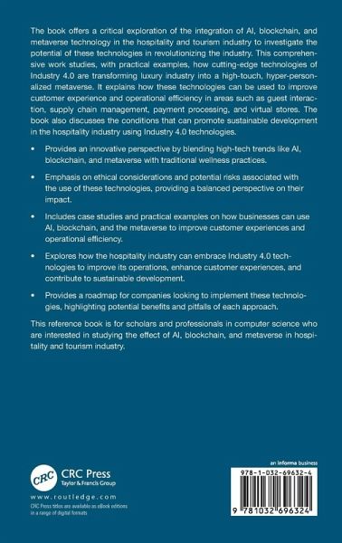 The book offers a critical exploration of the integration of AI, blockchain, and metaverse technology in the hospitality and tourism industry to investigate the potential of these technologies in revolutionizing the industry. This comprehensive work studies, with practical examples, how cutting-edge technologies of Industry 4.0 are transforming luxury industry into a high-touch, hyper-personalized metaverse. It explains how these technologies can be used to improve customer experience and operational efficiency in areas such as guest interaction, supply chain management, payment processing, and virtual stores. The book also discusses the conditions that can promote sustainable development in the hospitality industry using Industry 4.0 technologies. Provides an innovative perspective by blending high-tech trends like AI, blockchain, and metaverse with traditional wellness practicesEmphasis on ethical considerations and potential risks associated with the use of these technologies, providing a balanced perspective on their impactIncludes case studies and practical examples on how businesses can use AI, blockchain, and the metaverse to improve customer experiences and operational efficiencyExplores how the hospitality industry can embrace Industry 4.0 technologies to improve its operations, enhance customer experiences, and contribute to sustainable developmentProvides a roadmap for companies looking to implement these technologies, highlighting potential benefits and pitfalls of each approach This reference book is for scholars and professionals in computer science who are interested in studying the effect of AI, blockchain, and metaverse in hospitality and tourism industry.