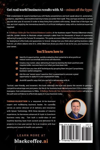 Get real-world business results with AI-minus all the hype. Well-credentialed AI experts bombard you with flashy presentations and tech speak about AI, automation, analytics, algorithms, and machine learning to keep you under their spell. They use hype and fear to control you and slow your AI success in order to keep lining their pockets with money. Break free of the hype and fear and start enjoying the tremendous benefits of artificial intelligence today with no technical expertise required! In AI Bullseye Tactics for Non-Technical Business Leaders, AI-for-business expert Thomas Gilbertson shares real-life, insider stories to illustrate unique concepts culled from his thousands of hours of experience delivering AI projects for Fortune 10 companies. This guide uncovers Gilbertson's 12 core business principles for deploying AI effectively and guarantees to forever change how you think about getting business value from AI. Let others debate what AI is, while Gilbertson shows you what AI can do for you, your business, and your career. You'll learn how toIdentify AI opportunities, quickly evaluating their potential to drive profits or reduce costs successfully and across all industries. Create a top-notch, value-delivering AI team by learning the team positions and required skills-success here is not what you have been told. Simplify how you view all AI techniques by grouping them into just 5 proprietary, business-useful categories. Ask the one "secret sauce" question that is guaranteed to uncover a great opportunity to apply AI in your organization today. Avoid 60 specific ways that you can fail to deliver value with AI. Tactical, user-friendly, and irreverent, this book sidesteps the hype and shares the secrets to gaining a competitive advantage over your peers. Get the AI-for-business book for everyone from CEOs to department managers, from entrepreneurs to MBAs. AI Bullseye Tactics for Non-Technical Business Leaders will give you the path and confidence to effectively apply AI in your business today.