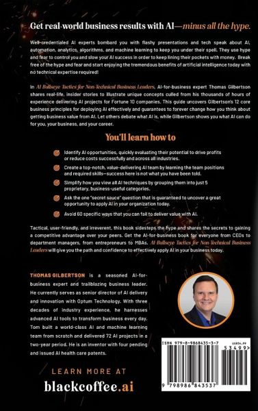 Get real-world business results with AI-minus all the hype. Well-credentialed AI experts bombard you with flashy presentations and tech speak about AI, automation, analytics, algorithms, and machine learning to keep you under their spell. They use hype and fear to control you and slow your AI success in order to keep lining their pockets with money. Break free of the hype and fear and start enjoying the tremendous benefits of artificial intelligence today with no technical expertise required! In AI Bullseye Tactics for Non-Technical Business Leaders, AI-for-business expert Thomas Gilbertson shares real-life, insider stories to illustrate unique concepts culled from his thousands of hours of experience delivering AI projects for Fortune 10 companies. This guide uncovers Gilbertson's 12 core business principles for deploying AI effectively and guarantees to forever change how you think about getting business value from AI. Let others debate what AI is, while Gilbertson shows you what AI can do for you, your business, and your career. You'll learn how toIdentify AI opportunities, quickly evaluating their potential to drive profits or reduce costs successfully and across all industries. Create a top-notch, value-delivering AI team by learning the team positions and required skills-success here is not what you have been told. Simplify how you view all AI techniques by grouping them into just 5 proprietary, business-useful categories. Ask the one "secret sauce" question that is guaranteed to uncover a great opportunity to apply AI in your organization today. Avoid 60 specific ways that you can fail to deliver value with AI. Tactical, user-friendly, and irreverent, this book sidesteps the hype and shares the secrets to gaining a competitive advantage over your peers. Get the AI-for-business book for everyone from CEOs to department managers, from entrepreneurs to MBAs. AI Bullseye Tactics for Non-Technical Business Leaders will give you the path and confidence to effectively apply AI in your business today.
