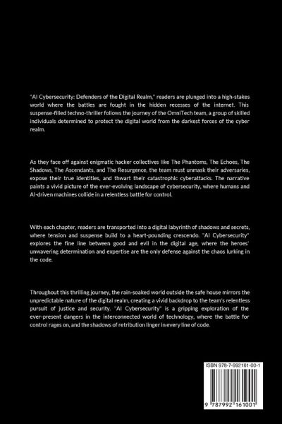 "AI Cybersecurity: Defenders of the Digital Realm," readers are plunged into a high-stakes world where the battles are fought in the hidden recesses of the internet. This suspense-filled techno-thriller follows the journey of the OmniTech team, a group of skilled individuals determined to protect the digital world from the darkest forces of the cyber realm. As they face off against enigmatic hacker collectives like The Phantoms, The Echoes, The Shadows, The Ascendants, and The Resurgence, the team must unmask their adversaries, expose their true identities, and thwart their catastrophic cyberattacks. The narrative paints a vivid picture of the ever-evolving landscape of cybersecurity, where humans and AI-driven machines collide in a relentless battle for control. With each chapter, readers are transported into a digital labyrinth of shadows and secrets, where tension and suspense build to a heart-pounding crescendo. "AI Cybersecurity" explores the fine line between good and evil in the digital age, where the heroes' unwavering determination and expertise are the only defense against the chaos lurking in the code. Throughout this thrilling journey, the rain-soaked world outside the safe house mirrors the unpredictable nature of the digital realm, creating a vivid backdrop to the team's relentless pursuit of justice and security. "AI Cybersecurity" is a gripping exploration of the ever-present dangers in the interconnected world of technology, where the battle for control rages on, and the shadows of retribution linger in every line of code.