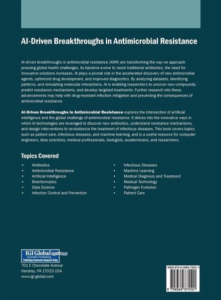 AI-driven breakthroughs in antimicrobial resistance (AMR) are transforming the way we approach pressing global health challenges. As bacteria evolve to resist traditional antibiotics, the need for innovative solutions increases. AI plays a pivotal role in the accelerated discovery of new antimicrobial agents, optimized drug development, and improved diagnostics. By analyzing datasets, identifying patterns, and simulating molecular interactions, AI is enabling researchers to uncover new compounds, predict resistance mechanisms, and develop targeted treatments. Further research into these advancements may help with drug-resistant infection mitigation and preventing the consequences of antimicrobial resistance. AI-Driven Breakthroughs in Antimicrobial Resistance explores the intersection of artificial intelligence and the global challenge of antimicrobial resistance. It delves into the innovative ways in which AI technologies are leveraged to discover new antibiotics, understand resistance mechanisms, and design interventions to revolutionize the treatment of infectious diseases. This book covers topics such as patient care, infectious diseases, and machine learning, and is a useful resource for computer engineers, data scientists, medical professionals, biologists, academicians, and researchers.