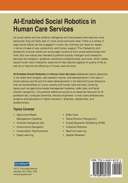 As social robots and the artificial intelligence (AI) that powers them become more advanced, they will likely take on more social and work roles. There is a variety of ways social robots can be engaged in human life, and they can leave an impact in terms of ease of use, productivity, and human support. The interactivity and receptivity of social robots can encourage humans to form social relationships with them. But now robots are intended to perform socially intelligent and interactive services like reception, guidance, emotional companionship, and more, which makes social human-robot interaction essential to help improve aspects of quality of life as well as to improve the efficiency of human care services. AI-Enabled Social Robotics in Human Care Services addresses recent advances in the latest technologies, new research results, and developments in the area of social robotics and AI and the latest developments in the field and future directions that can be beneficial to human society and human care services. Covering topics such as agriculture waste management systems, elder care, and facial emotion recognition, this premier reference source is an essential resource for AI professionals, computer scientists, robotics engineers, human care professionals, students and educators of higher education, librarians, researchers, and academicians.
