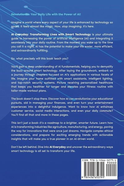 Revolutionize Your Daily Life with the Power of AI! Imagine a world where every aspect of your life is enhanced by technology so smart, it feels almost like magic. Now, stop imagining. It's here. AI Everyday: Transforming Lives with Smart Technology is your ultimate guide to harnessing the power of artificial intelligence (AI) and integrating it seamlessly into your daily routine. From the moment you wake up to the time you call it a night, AI has the potential to make your life easier, more efficient, and extraordinarily fulfilling. So, what precisely will this book teach you? You'll gain a deep understanding of AI fundamentals, helping you to demystify the buzz around smart technology. After laying the groundwork, embark on a journey through chapters focused on AI's applications in various facets of life. Imagine your home outfitted with smart assistants, intelligent lighting, and top-notch security systems. Picture receiving personalized healthcare that keeps you healthier for longer and elevates your fitness routine with tailor-made workout plans. The book doesn't stop there. Discover how AI can revolutionize your educational pursuits, aid in managing your finances, and even turn your entertainment experiences into a delightful indulgence. Want to know how AI enhances customer service, social media interactions, and even your daily commute? You'll find all that and more in these pages. This isn't just a book-it's a roadmap to a brighter, smarter future. Learn how AI is transforming industries like agriculture, manufacturing, and energy, paving the way for innovations that were once just dreams. Navigate complex ethical considerations, and prepare for exciting emerging trends with actionable insights that will make you a true pioneer in an AI-driven world. Don't be left behind. Dive into AI Everyday and uncover the extraordinary ways smart technology is all set to transform your life.