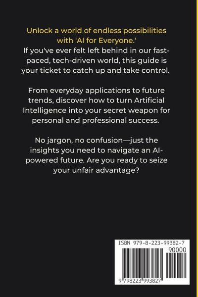 Unveil the Hidden Power of AI: Your Essential Guide to Making Artificial Intelligence an Ally in Everyday Life! Picture this: you're navigating a world where artificial intelligence is no longer the stuff of science fiction but a daily reality that influences everything from your shopping choices to your health decisions. Yet, despite AI being around you, you feel like you're standing on the outskirts of a revolution, unsure how to participate. The language is complex, the technology intimidating, and the possibilities seemingly endless—but unclear. You know there's a way to harness AI for personal gain, but how? I'm Brendan, and I've dedicated my career to making complex technologies accessible and beneficial to everyday people. My mission is to pull back the curtain on the mystery surrounding AI, breaking it down into relatable insights and practical advice that you can apply now, regardless of your background. In "AI for Everyone," you'll find the roadmap to understanding and harnessing the untapped potential of artificial intelligence. By reading this guide, you'll:Demystify the core concepts of AI and machine learning in straightforward terms. Discover practical, real-world applications of AI that you can implement today. Unearth the potential risks and ethical considerations while leveraging AI. And that's just scratching the surface. Step into the world of AI with confidence and curiosity, unlocking opportunities you've never imagined possible. This is your chance to be part of a future already here. Don't miss out!