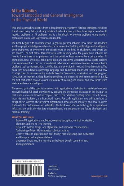 The book begins with an introduction to general-purpose robotics, how robots are modeled, and how physical intelligence relates to the movement of building artificial general intelligence, while giving you an overview of the current state of the field, its challenges, and where we are headed. The first half of this book delves into defining what the problems in robotics are, how to frame them as AI problems, and the details of how to solve them using modern AI techniques. First, we look at robot perception and sensing to understand how robots perceive their environment, and discuss convolutional networks and vision transformers to solve robotics problems such as segmentation, classification, and detection in two and three dimensions. The book then details how to apply large language and multimodal models for robotics, and how to adapt them to solve reasoning and robot control. Simulation, localization, and mapping and navigation are framed as deep learning problems and discussed with recent research. Lastly, the first part of this book discusses reinforcement learning and control and how robots learn via trial and error and self-play.