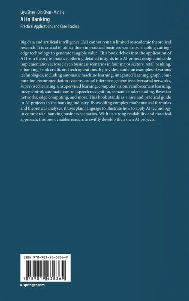 Big data and artificial intelligence (AI) cannot remain limited to academic theoretical research. It is crucial to utilize them in practical business scenarios, enabling cutting-edge technology to generate tangible value. This book delves into the application of AI from theory to practice, offering detailed insights into AI project design and code implementation across eleven business scenarios in four major sectors: retail banking, e-banking, bank credit, and tech operations. It provides hands-on examples of various technologies, including automatic machine learning, integrated learning, graph computation, recommendation systems, causal inference, generative adversarial networks, supervised learning, unsupervised learning, computer vision, reinforcement learning, fuzzy control, automatic control, speech recognition, semantic understanding, Bayesian networks, edge computing, and more. This book stands as a rare and practical guide to AI projects in the banking industry. By avoiding complex mathematical formulas and theoretical analyses, it uses plain language to illustrate how to apply AI technology in commercial banking business scenarios. With its strong readability and practical approach, this book enables readers to swiftly develop their own AI projects.