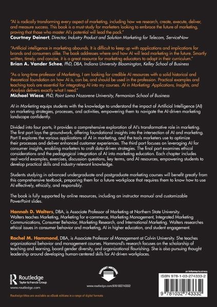 Divided into four parts, it provides a comprehensive exploration of AI's transformative role in marketing. The first part lays the groundwork, offering foundational insights into the intersection of AI and marketing. Part II explores the various applications of AI in marketing, and the tools marketers use to optimize their processes and deliver enhanced customer experiences. The third part focuses on leveraging AI for consumer insights, enabling marketers to craft data-driven strategies. The final part examines ethical considerations and the pedagogical integration of AI into marketing education. Each chapter includes real-world examples, exercises, discussion questions, key terms, and AI resources, empowering students to develop practical skills and industry-relevant knowledge.