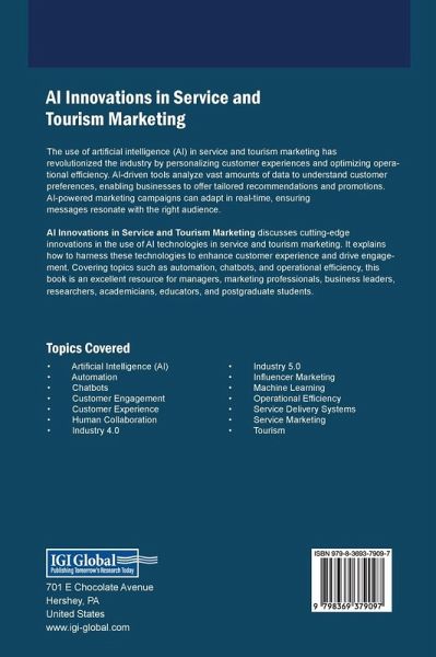 The use of artificial intelligence (AI) in service and tourism marketing has revolutionized the industry by personalizing customer experiences and optimizing operational efficiency. AI-driven tools analyze vast amounts of data to understand customer preferences, enabling businesses to offer tailored recommendations and promotions. AI-powered marketing campaigns can adapt in real-time, ensuring messages resonate with the right audience. AI Innovations in Service and Tourism Marketing discusses cutting-edge innovations in the use of AI technologies in service and tourism marketing. It explains how to harness these technologies to enhance customer experience and drive engagement. Covering topics such as automation, chatbots, and operational efficiency, this book is an excellent resource for managers, marketing professionals, business leaders, researchers, academicians, educators, and postgraduate students.
