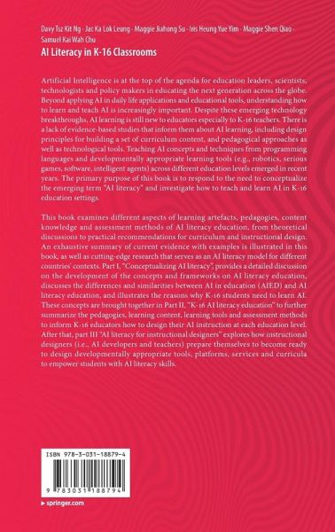 Artificial Intelligence is at the top of the agenda for education leaders, scientists, technologists and policy makers in educating the next generation across the globe. Beyond applying AI in daily life applications and educational tools, understanding how to learn and teach AI is increasingly important. Despite these emerging technology breakthroughs, AI learning is still new to educators especially to K-16 teachers. There is a lack of evidence-based studies that inform them about AI learning, including design principles for building a set of curriculum content, and pedagogical approaches as well as technological tools. Teaching AI concepts and techniques from programming languages and developmentally appropriate learning tools (e.g., robotics, serious games, software, intelligent agents) across different education levels emerged in recent years. The primary purpose of this book is to respond to the need to conceptualize the emerging term "AI literacy" and investigate how toteach and learn AI in K-16 education settings. This book examines different aspects of learning artefacts, pedagogies, content knowledge and assessment methods of AI literacy education, from theoretical discussions to practical recommendations for curriculum and instructional design. An exhaustive summary of current evidence with examples is illustrated in this book, as well as cutting-edge research that serves as an AI literacy model for different countries' contexts. Part I, "Conceptualizing AI literacy", provides a detailed discussion on the development of the concepts and frameworks on AI literacy education, discusses the differences and similarities between AI in education (AIED) and AI literacy education, and illustrates the reasons why K-16 students need to learn AI. These concepts are brought together in Part II, "K-16 AI literacy education" to further summarize the pedagogies, learning content, learning tools and assessment methods to inform K-16educators how to design their AI instruction at each education level. After that, part III "AI literacy for instructional designers" explores how instructional designers (i.e., AI developers and teachers) prepare themselves to become ready to design developmentally appropriate tools, platforms, services and curricula to empower students with AI literacy skills.