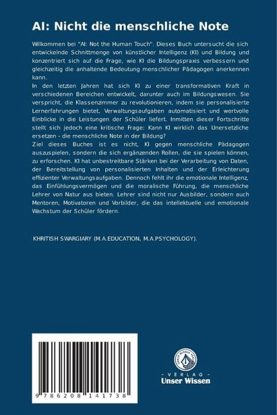 Willkommen bei "AI: Not the Human Touch". Dieses Buch untersucht die sich entwickelnde Schnittmenge von künstlicher Intelligenz (KI) und Bildung und konzentriert sich auf die Frage, wie KI die Bildungspraxis verbessern und gleichzeitig die anhaltende Bedeutung menschlicher Pädagogen anerkennen kann.In den letzten Jahren hat sich KI zu einer transformativen Kraft in verschiedenen Bereichen entwickelt, darunter auch im Bildungswesen. Sie verspricht, die Klassenzimmer zu revolutionieren, indem sie personalisierte Lernerfahrungen bietet, Verwaltungsaufgaben automatisiert und wertvolle Einblicke in die Leistungen der Schüler liefert. Inmitten dieser Fortschritte stellt sich jedoch eine kritische Frage: Kann KI wirklich das Unersetzliche ersetzen - die menschliche Note in der Bildung?Ziel dieses Buches ist es nicht, KI gegen menschliche Pädagogen auszuspielen, sondern die sich ergänzenden Rollen, die sie spielen können, zu erforschen. KI hat unbestreitbare Stärken bei der Verarbeitung von Daten, der Bereitstellung von personalisierten Inhalten und der Erleichterung effizienter Verwaltungsaufgaben. Dennoch fehlt ihr die emotionale Intelligenz, das Einfühlungsvermögen und die moralische Führung, die menschliche Lehrer von Natur aus bieten. Lehrer sind nicht nur Ausbilder, sondern auch Mentoren, Motivatoren und Vorbilder, die das intellektuelle und emotionale Wachstum der Schüler fördern.