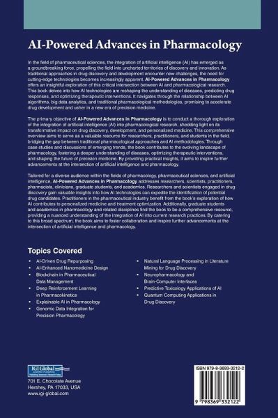 In the field of pharmaceutical sciences, the integration of artificial intelligence (AI) has emerged as a groundbreaking force, propelling the field into uncharted territories of discovery and innovation. As traditional approaches in drug discovery and development encounter new challenges, the need for cutting-edge technologies becomes increasingly apparent. AI-Powered Advances in Pharmacology offers an insightful exploration of this critical intersection between AI and pharmacological research. This book delves into how AI technologies are reshaping the understanding of diseases, predicting drug responses, and optimizing therapeutic interventions. It navigates through the relationship between AI algorithms, big data analytics, and traditional pharmacological methodologies, promising to accelerate drug development and usher in a new era of precision medicine. The primary objective of AI-Powered Advances in Pharmacology is to conduct a thorough exploration of the integration of artificial intelligence (AI) into pharmacological research, shedding light on its transformative impact on drug discovery, development, and personalized medicine. This comprehensive overview aims to serve as a valuable resource for researchers, practitioners, and students in the field, bridging the gap between traditional pharmacological approaches and AI methodologies. Through case studies and discussions of emerging trends, the book contributes to the evolving landscape of pharmacology, fostering a deeper understanding of diseases, optimizing therapeutic interventions, and shaping the future of precision medicine. By providing practical insights, it aims to inspire further advancements at the intersection of artificial intelligence and pharmacology.