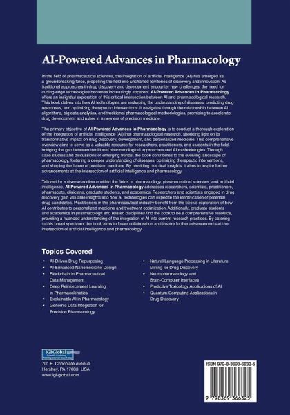 In the field of pharmaceutical sciences, the integration of artificial intelligence (AI) has emerged as a groundbreaking force, propelling the field into uncharted territories of discovery and innovation. As traditional approaches in drug discovery and development encounter new challenges, the need for cutting-edge technologies becomes increasingly apparent. AI-Powered Advances in Pharmacology offers an insightful exploration of this critical intersection between AI and pharmacological research. This book delves into how AI technologies are reshaping the understanding of diseases, predicting drug responses, and optimizing therapeutic interventions. It navigates through the relationship between AI algorithms, big data analytics, and traditional pharmacological methodologies, promising to accelerate drug development and usher in a new era of precision medicine. The primary objective of AI-Powered Advances in Pharmacology is to conduct a thorough exploration of the integration of artificial intelligence (AI) into pharmacological research, shedding light on its transformative impact on drug discovery, development, and personalized medicine. This comprehensive overview aims to serve as a valuable resource for researchers, practitioners, and students in the field, bridging the gap between traditional pharmacological approaches and AI methodologies. Through case studies and discussions of emerging trends, the book contributes to the evolving landscape of pharmacology, fostering a deeper understanding of diseases, optimizing therapeutic interventions, and shaping the future of precision medicine. By providing practical insights, it aims to inspire further advancements at the intersection of artificial intelligence and pharmacology.