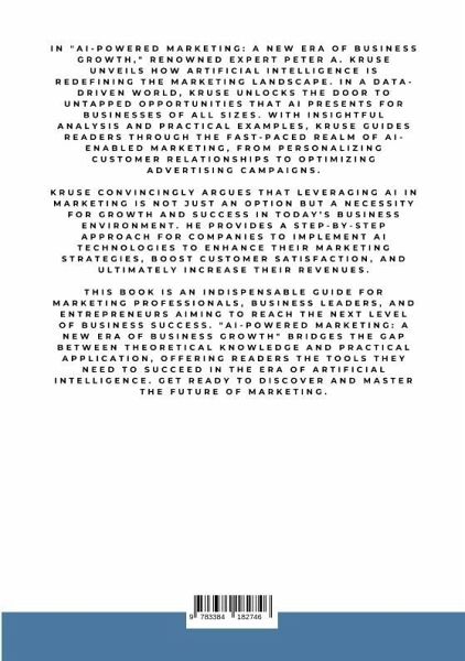 In "AI-Powered Marketing: A New Era of Business Growth," renowned expert Peter A. Kruse unveils how artificial intelligence is redefining the marketing landscape. In a data-driven world, Kruse unlocks the door to untapped opportunities that AI presents for businesses of all sizes. With insightful analysis and practical examples, Kruse guides readers through the fast-paced realm of AI-enabled marketing, from personalizing customer relationships to optimizing advertising campaigns.Kruse convincingly argues that leveraging AI in marketing is not just an option but a necessity for growth and success in today's business environment. He provides a step-by-step approach for companies to implement AI technologies to enhance their marketing strategies, boost customer satisfaction, and ultimately increase their revenues.This book is an indispensable guide for marketing professionals, business leaders, and entrepreneurs aiming to reach the next level of business success. "AI-Powered Marketing: A New Era of Business Growth" bridges the gap between theoretical knowledge and practical application, offering readers the tools they need to succeed in the era of artificial intelligence. Get ready to discover and master the future of marketing.