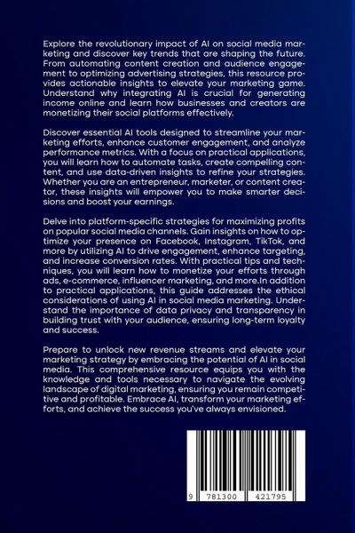 Explore the revolutionary impact of AI on social media marketing and discover key trends that are shaping the future. From automating content creation and audience engagement to optimizing advertising strategies, this resource provides actionable insights to elevate your marketing game. Understand why integrating AI is crucial for generating income online and learn how businesses and creators are monetizing their social platforms effectively. Discover essential AI tools designed to streamline your marketing efforts, enhance customer engagement, and analyze performance metrics. With a focus on practical applications, you will learn how to automate tasks, create compelling content, and use data-driven insights to refine your strategies. Whether you are an entrepreneur, marketer, or content creator, these insights will empower you to make smarter decisions and boost your earnings. Delve into platform-specific strategies for maximizing profits on popular social media channels. Gain insights on how to optimize your presence on Facebook, Instagram, TikTok, and more by utilizing AI to drive engagement, enhance targeting, and increase conversion rates. With practical tips and techniques, you will learn how to monetize your efforts through ads, e-commerce, influencer marketing, and more.In addition to practical applications, this guide addresses the ethical considerations of using AI in social media marketing. Understand the importance of data privacy and transparency in building trust with your audience, ensuring long-term loyalty and success. Prepare to unlock new revenue streams and elevate your marketing strategy by embracing the potential of AI in social media. This comprehensive resource equips you with the knowledge and tools necessary to navigate the evolving landscape of digital marketing, ensuring you remain competitive and profitable. Embrace AI, transform your marketing efforts, and achieve the success you've always envisioned.