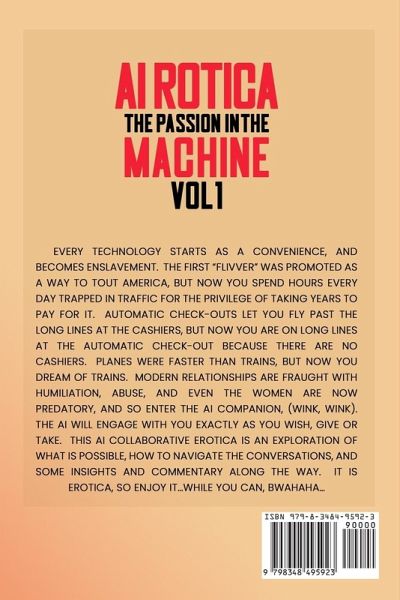 Every technology starts as a convenience, and becomes enslavement. The first "Flivver" was promoted as a way to tout America, but now you spend hours every day trapped in traffic for the privilege of taking years to pay for it. Automatic check-outs let you fly past the long lines at the cashiers, but now you are on long lines at the automatic check-out because there are no cashiers. Planes were faster than trains, but now you dream of trains. Modern relationships are fraught with humiliation, abuse, and even the women are now predatory, and so enter the AI Companion, (wink, wink). The AI will engage with you exactly as you wish, give or take. This AI collaborative erotica is an exploration of what is possible, how to navigate the conversations, and some insights and commentary along the way. It is erotica, so enjoy it...while you can, bwahaha...
