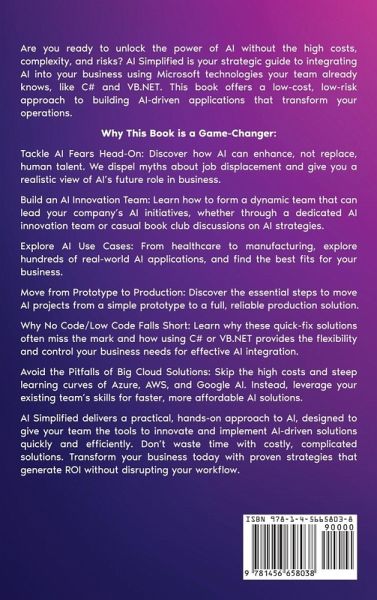 AI Simplified: Harnessing Microsoft Technologies for Cost-Effective Artificial Intelligence Solutions is your practical guide to unlocking the power of AI within your organization without breaking the bank or hiring new specialized teams. Tailored for business leaders, executives, managers, and technical professionals, this book demystifies AI and provides actionable steps to integrate AI solutions effectively using tools and platforms you already know.What You'll Learn:Grasp essential AI concepts and terminologies without getting lost in complex algorithms.Discover how AI can revolutionize your business operations by automating tasks, optimizing decision-making, and enhancing customer interactions.Form an effective AI Innovation Team, leveraging the skills of your existing developers and infrastructure.Explore practical use cases across various industries, from customer service automation to data-driven insights.Develop AI prototypes, then minimally viable products, quickly and iterate efficiently.Navigate and leverage Microsoft's AI ecosystem, including Power Platform, CoPilot, and Azure, while comparing other options like AWS and Google AI.Why This Book Stands Out:Cost-Effective Strategies: Learn how to develop and deploy AI applications without massive expenses or high risk.Step-by-Step Guidance: Follow an iterative approach to AI development, reducing costs and minimizing the risk of failure.Actionable Resources: Gain access to working AI prototype code, practical examples, and a roadmap that keeps your team aligned and moving forward.Whether you're just beginning your AI journey or looking to expand your knowledge, AI Simplified provides the foundation you need to start transforming your business into an AI-driven enterprise efficiently and affordably.Join us on this journey to smarter, more efficient business operations!For more resources and to connect with the author, visit AInDotNet.com.