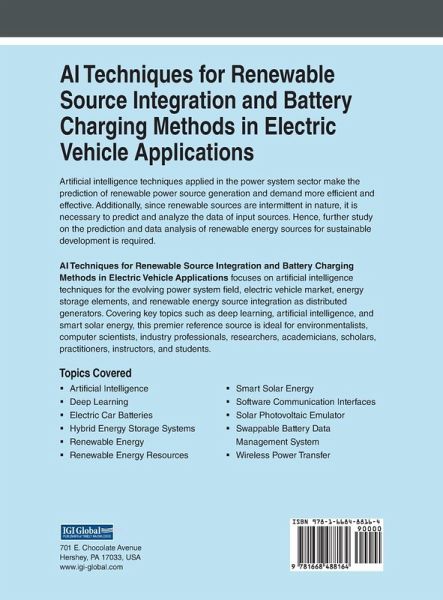 Artificial intelligence techniques applied in the power system sector make the prediction of renewable power source generation and demand more efficient and effective. Additionally, since renewable sources are intermittent in nature, it is necessary to predict and analyze the data of input sources. Hence, further study on the prediction and data analysis of renewable energy sources for sustainable development is required. AI Techniques for Renewable Source Integration and Battery Charging Methods in Electric Vehicle Applications focuses on artificial intelligence techniques for the evolving power system field, electric vehicle market, energy storage elements, and renewable energy source integration as distributed generators. Covering key topics such as deep learning, artificial intelligence, and smart solar energy, this premier reference source is ideal for environmentalists, computer scientists, industry professionals, researchers, academicians, scholars, practitioners, instructors, and students.