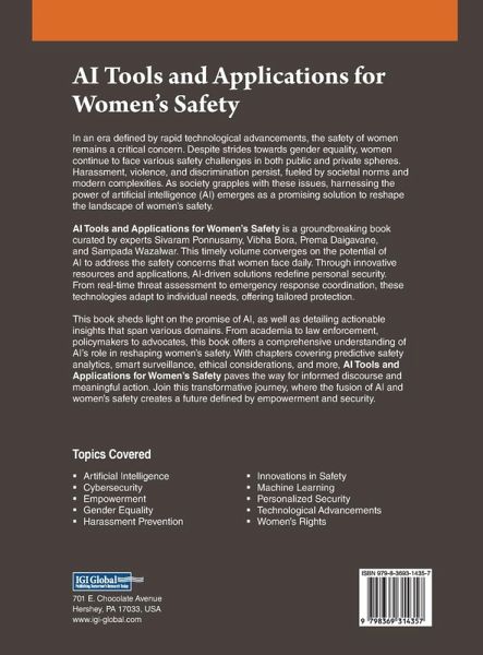 In an era marked by rapid technological progress, women's safety remains a pressing concern despite strides toward gender equality. Women continue to grapple with safety challenges in both public and private spaces, enduring harassment, violence, and discrimination driven by entrenched societal norms and modern complexities. Amidst these challenges, harnessing the potential of artificial intelligence (AI) emerges as a promising avenue to reshape the landscape of women's safety. The groundbreaking book, AI Tools and Applications for Women's Safety , curated by experts Sivaram Ponnusamy, Vibha Bora, Prema Daigavane, and Sampada Wazalwar, delves into the transformative power of AI to address the daily safety concerns women face. This timely volume explores innovative AI-driven resources and applications that redefine personal security, offering tailored protection through real-time threat assessment and emergency response coordination. With comprehensive insights spanning academia, law enforcement, policymaking, and advocacy, this book covers predictive safety analytics, smart surveillance, ethical considerations, and more. AI Tools and Applications for Women's Safety not only sheds light on the promise of AI but also paves the way for informed discourse and meaningful action, ushering in a future defined by women's empowerment and security.