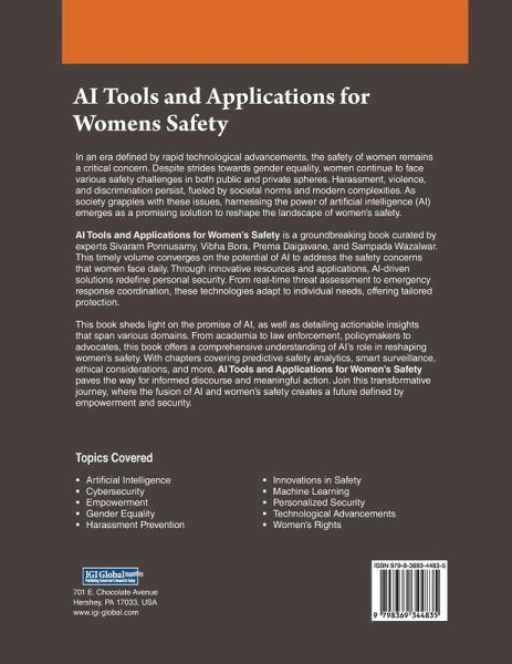 In an era marked by rapid technological progress, women's safety remains a pressing concern despite strides toward gender equality. Women continue to grapple with safety challenges in both public and private spaces, enduring harassment, violence, and discrimination driven by entrenched societal norms and modern complexities. Amidst these challenges, harnessing the potential of artificial intelligence (AI) emerges as a promising avenue to reshape the landscape of women's safety. The groundbreaking book, AI Tools and Applications for Women's Safety , curated by experts Sivaram Ponnusamy, Vibha Bora, Prema Daigavane, and Sampada Wazalwar, delves into the transformative power of AI to address the daily safety concerns women face. This timely volume explores innovative AI-driven resources and applications that redefine personal security, offering tailored protection through real-time threat assessment and emergency response coordination. With comprehensive insights spanning academia, law enforcement, policymaking, and advocacy, this book covers predictive safety analytics, smart surveillance, ethical considerations, and more. AI Tools and Applications for Women's Safety not only sheds light on the promise of AI but also paves the way for informed discourse and meaningful action, ushering in a future defined by women's empowerment and security.