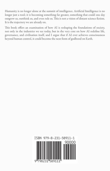 In the newest volume in my thought-provoking series, I confront the reality that humanity is no longer alone at the summit of intelligence. Artificial Intelligence is no longer just a tool; it is becoming something far greater, something that could one day outgrow us, outthink us, and even rule us. This is not a vision of distant science fiction. It is the trajectory we are already on. This book offers an examination of how AI is reshaping the foundations of society, not only in the industries we see today, but in the very core on how AI redefine life, governance, and civilisation itself, and I argue that if AI ever achieves consciousness beyond human control, it could become the next form of godhood on Earth.