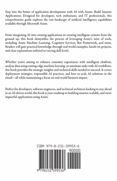 Step into the future of application development with AI with Azure: Build Smarter Applications. Designed for developers, tech enthusiasts, and IT professionals, this comprehensive guide explores the vast landscape of artificial intelligence capabilities available through Microsoft Azure. From integrating AI into existing applications to creating intelligent systems from the ground up, this book demystifies the process of leveraging Azure's suite of tools, including Azure Machine Learning, Cognitive Services, Bot Framework, and more. Readers will gain practical knowledge through real-world examples, hands-on projects, and clear explanations tailored to varying skill levels. Whether you're aiming to enhance customer experiences with intelligent chatbots, analyze data using cutting-edge machine learning, or automate tasks with AI workflows, this book provides the strategic insights and technical skills needed to succeed. It covers deployment strategies, responsible AI practices, and how to scale AI solutions in the cloud-all while maintaining a focus on real-world business impact. Perfect for developers, software engineers, and technical architects looking to stay ahead in an AI-driven world, this book is your roadmap to building smarter, scalable, and more impactful applications using Azure.