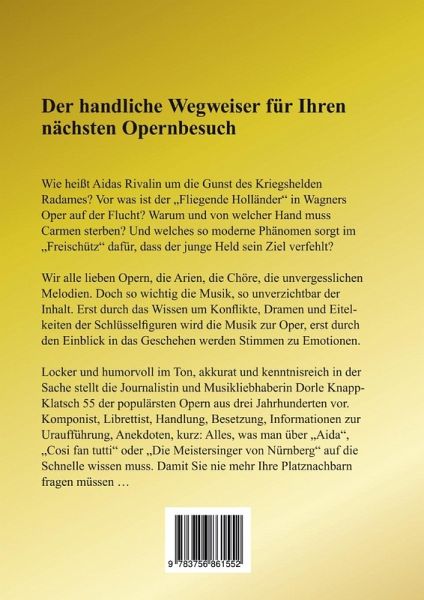 Schwerpunkt OpernhandlungWir alle lieben Opern, die Arien, die Chöre, die unvergesslichen Melodien. Doch so wichtig die Musik, so unverzichtbar der Inhalt. Erst durch das Wissen um Konflikte, Dramen und Eitelkeiten der Schlüsselfiguren wird die Musik zur Oper, erst durch den Einblick in das Geschehen werden Stimmen zu Emotionen.Opern:Aida; Alcina; Ariadne auf Naxos; Carmen; Chowanschtschina; Cosi fan tutte; Das Kind und die Zauberdinge; Der Barbier von Sevilla; Der Fliegende Holländer; Der Freischütz; Die Fledermaus; Die glückliche Hand; Die Liebe zu den drei Orangen; Don Giovanni; Draußen vor der Tür; Eugen Onegin; Falstaff; Fausts Verdammnis; Fidelio; Figaros Hochzeit; Gegen die Wand; Götterdämmerung; Herzog Blaubarts Burg; Idomeneo; Il mondo della luna; Katja Kabanova; La Boheme; La Cenerentola; La Sonnambula; La Traviata; Lohengrin; Lucio Silla; Luisa Miller; Madama Butterfly; Meistersinger; Nabucco; Norma; Orpheus und Eurydike; Parsifal; Pnima; Randolphs Erben; Rheingold; Rosenkavalier; Salome; Schaum der Tage; Schicksal; Siegfried; Tannhäuser; Teseo; Tosca; Tristan und Isolde; Walküre; Wozzek; Wunderzaichen; Zauberflöte