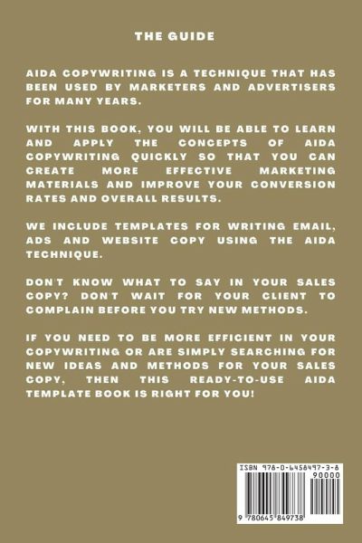 AIDA copywriting is a technique that has been used by marketers and advertisers for many years. It is a way of structuring your message in order to get the most impact and response from your audience. Many copywriters use a variation of the AIDA formula without even realising it! With this book, you will be able to learn and apply the concepts of AIDA Copywriting quickly so that you can create more effective marketing materials and improve your conversion rates and overall results. We include templates for writing email, ads and website copy using the AIDA technique. We also show how AI writers can help you write compelling sales copy. Don't know what to say in your sales copy? Read our guide, use our templates and if you still need help then let AI do the work for you. If you need to be more efficient in your copywriting or are simply searching for new ideas and methods for your sales copy, then this ready-to-use AIDA template book is right for you!