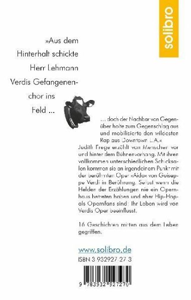 'Aus dem Hinterhalt schickte Herr Lehmann Verdis Gefangenenchor ins Feld. doch der Nachbar von Gegenüber holte zum Gegenschlag aus und mobilisierte den wildesten Rap aus Downtown L.A.' Judith Frege erzählt von Menschen vor und hinter dem Bühnenvorhang. Mit ihren vollkommen unterschiedlichen Schicksalen kommen sie an irgendeinem Punkt mit der berühmten Oper 'Aida' von Guiseppe Verdi in Berührung. Selbst wenn die Helden der Erzählungen nie ein Opernhaus betreten haben und eher Hip-Hop- als Opernfans sind: Ihr Leben wird von Verdis Oper beeinflusst. So auch weitere Menschen, die im Opernbetrieb (u.a.) als Toilettenfrau, Regisseur, Kostümschneiderin, Orchestermusiker oder Tänzerin arbeiten, Menschen, die im Publikum sitzen und als gefürchteter Kritiker, als eingekaufter Claqueur oder als ganz normaler Zuschauer auf das Öffnen des Bühnenvorhangs warten. Und ob wohl Clochard Richard von Andersleben, der allabendlich mit einem Schild - "Suche Karte" - vor dem Operneingang steht, letzlich Glück haben wird? Jede der 16 sehr unterschiedlichen Geschichten berührt auf einzigartige Weise.