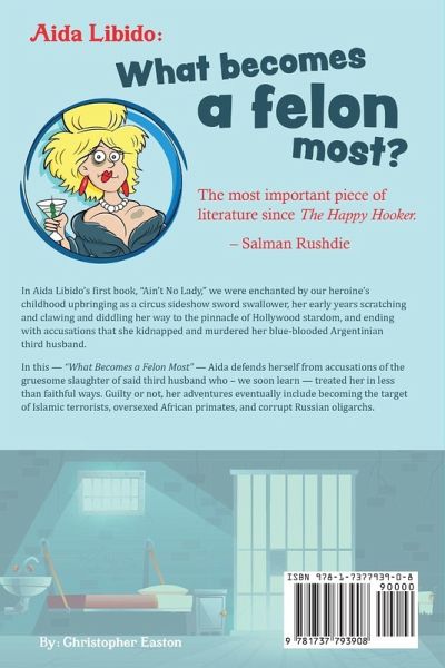 In Aida Libido's first book, "Ain't No Lady," we were enchanted by our heroine's childhood upbringing as a circus sideshow sword swallower, her early years scratching and clawing and diddling her way to the pinnacle of Hollywood stardom, and ending with accusations that she kidnapped and murdered her blue-blooded Argentinian third husband. In this "What Becomes a Felon Most" - Volume 2 in the AIN'T NO LADY saga -- Aida defends herself from accusations of the gruesome slaughter of said third husband who (we soon learn) treated her in less than faithful ways. Guilty or not, her adventures eventually include becoming the target of Islamic terrorists, oversexed African primates, and corrupt Russian oligarchs. The big question is: Will she ever find true love?