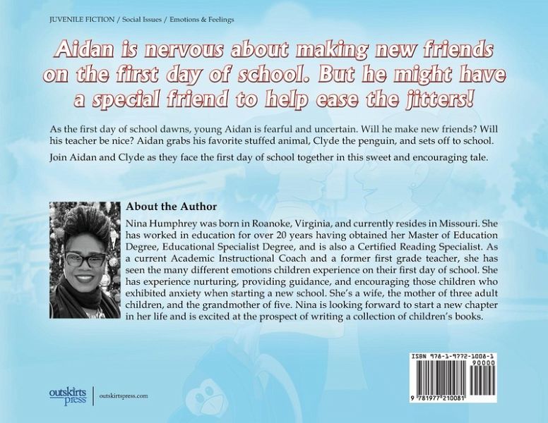 Aidan Takes Clyde to School is an encouraging story that provides a glimpse of the many conflicted feelings children may experience when starting school for the first time. Aidan is nervous about making new friends on the first day of school. He experiences a combination of emotions that includes fear and uncertainty. Aidan brings his favorite stuffed animal Clyde to school to help him cope with his first day of school jitters. How would Clyde's presence help Aidan?
