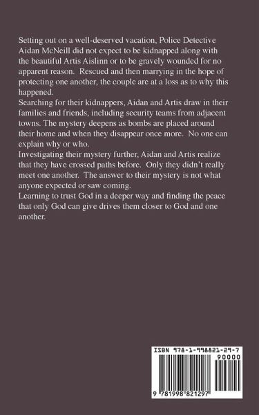 Setting out on a well-deserved vacation, Police Detective Aidan McNeill did not expect to be kidnapped along with the beautiful Artis Aislinn or to be gravely wounded for no apparent reason. Rescued and then marrying in the hope of protecting one another, the couple are at a loss as to why this happened. Searching for their kidnappers, Aidan and Artis draw in their families and friends, including security teams from adjacent towns. The mystery deepens as bombs are placed around their home and when they disappear once more. No one can explain why or who. Investigating their mystery further, Aidan and Artis realize that they have crossed paths before. Only they didn't really meet one another. The answer to their mystery is not what anyone expected or saw coming. Learning to trust God in a deeper way and finding the peace that only God can give drives them closer to God and one another.