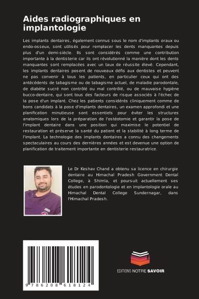 Les implants dentaires, également connus sous le nom d'implants oraux ou endo-osseux, sont utilisés pour remplacer les dents manquantes depuis plus d'un demi-siècle. Ils sont considérés comme une contribution importante à la dentisterie car ils ont révolutionné la manière dont les dents manquantes sont remplacées avec un taux de réussite élevé. Cependant, les implants dentaires posent de nouveaux défis aux dentistes et peuvent ne pas convenir à tous les patients, en particulier ceux qui ont des antécédents de tabagisme ou de tabagisme actuel, de maladie parodontale, de diabète sucré non contrôlé ou mal contrôlé, ou de mauvaise hygiène bucco-dentaire, qui sont tous des facteurs de risque associés à l'échec de la pose d'un implant. Chez les patients considérés cliniquement comme de bons candidats à la pose d'implants dentaires, un examen approfondi et une planification minutieuse sont essentiels pour éviter les structures anatomiques lors de la préparation de l'ostéotomie et garantir la pose de l'implant dentaire dans une position qui maximise le potentiel de restauration et préserve la santé du patient et la stabilité à long terme de l'implant. La technologie des implants dentaires a connu des changements spectaculaires au cours des dernières années et est devenue une option de planification de traitement importante en dentisterie restauratrice.