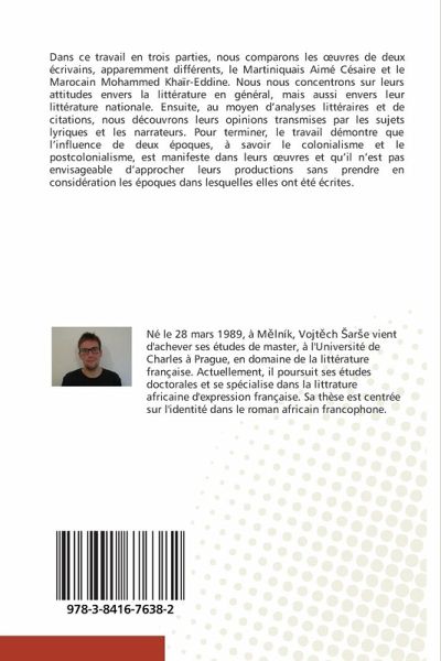 Dans ce travail en trois parties, nous comparons les oeuvres de deux écrivains, apparemment différents, le Martiniquais Aimé Césaire et le Marocain Mohammed Khaïr-Eddine. Nous nous concentrons sur leurs attitudes envers la littérature en général, mais aussi envers leur littérature nationale. Ensuite, au moyen d'analyses littéraires et de citations, nous découvrons leurs opinions transmises par les sujets lyriques et les narrateurs. Pour terminer, le travail démontre que l'influence de deux époques, à savoir le colonialisme et le postcolonialisme, est manifeste dans leurs oeuvres et qu'il n'est pas envisageable d'approcher leurs productions sans prendre en considération les époques dans lesquelles elles ont été écrites.