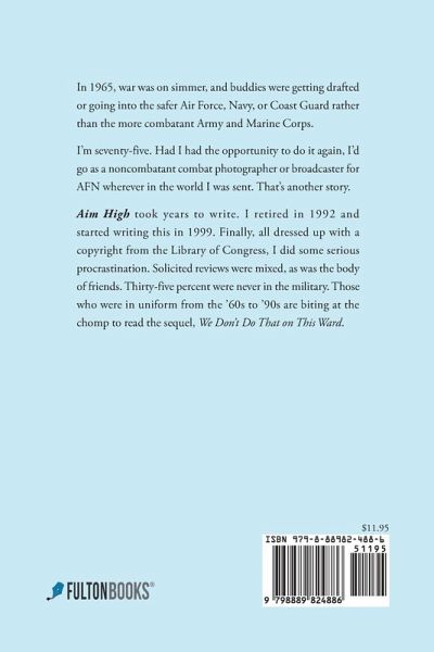 In 1965, war was on simmer, and buddies were getting drafted or going into the safer Air Force, Navy, or Coast Guard rather than the more combatant Army and Marine Corps. I'm seventy-five. Had I had the opportunity to do it again, I'd go as a noncombatant combat photographer or broadcaster for AFN wherever in the world I was sent. That's another story. Aim High took years to write. I retired in 1992 and started writing this in 1999. Finally, all dressed up with a copyright from the Library of Congress, I did some serious procrastination. Solicited reviews were mixed, as was the body of friends. Thirty-five percent were never in the military. Those who were in uniform from the '60s to '90s are biting at the chomp to read the sequel, We Don't Do That on This Ward.