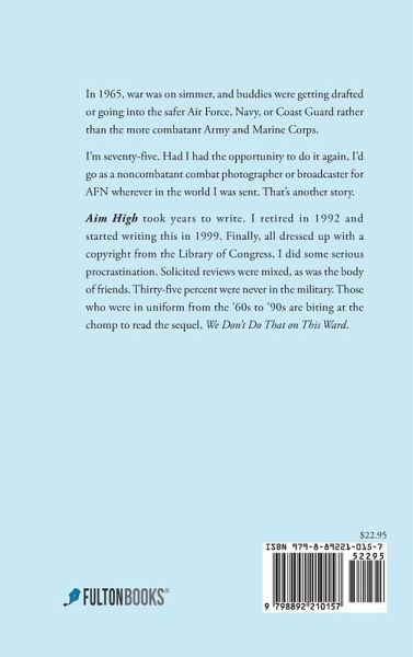 In 1965, war was on simmer, and buddies were getting drafted or going into the safer Air Force, Navy, or Coast Guard rather than the more combatant Army and Marine Corps. I'm seventy-five. Had I had the opportunity to do it again, I'd go as a noncombatant combat photographer or broadcaster for AFN wherever in the world I was sent. That's another story. Aim High took years to write. I retired in 1992 and started writing this in 1999. Finally, all dressed up with a copyright from the Library of Congress, I did some serious procrastination. Solicited reviews were mixed, as was the body of friends. Thirty-five percent were never in the military. Those who were in uniform from the '60s to '90s are biting at the chomp to read the sequel, We Don't Do That on This Ward.