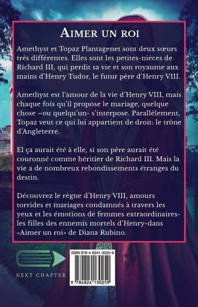 Amethyst et Topaz Plantagenet sont deux s¿urs très différentes. Elles sont les petites-nièces de Richard III, qui perdit sa vie et son royaume aux mains d'Henry Tudor, le futur père d'Henry VIII. Amethyst est l'amour de la vie d'Henry VIII, mais chaque fois qu'il propose le mariage, quelque chose -ou quelqu'un- s'interpose. Parallèlement, Topaz veut ce qui lui appartient de droit: le trône d'Angleterre. El ça aurait été à elle, si son père aurait été couronné comme héritier de Richard III. Mais la vie a de nombreux rebondissements étranges du destin. Découvrez le règne d'Henry VIII, amours torrides et mariages condamnés à travers les yeux et les émotions de femmes extraordinaires-les filles des ennemis mortels d'Henry-dans Aimer un roi de Diana Rubino.