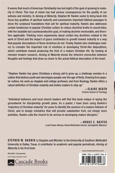 It seems that much of American Christianity has lost sight of the goal of growing to maturity in Christ. This loss of vision has had serious consequences for the quality of our witness and ministry. In Aiming at Maturity, Steven W. Rankin seeks to bring back into focus key qualities of spiritual maturity and summarizes important biblical passages to show the scriptural foundations that call for spiritual maturity. Rankin also addresses certain tendencies in popular Christian culture to reduce doctrinal truths to sound bites with the laudable but counterproductive goal to make doctrine memorable, therefore applicable. Thinking more expansively about certain key doctrines related to the work of Christ and the impact of grace contributes to growth toward maturity in a way that popular descriptions of these doctrines do not. Finally, Rankin also challenges readers to consider the important role of emotions in developing Christlike dispositions, which contribute toward producing the fruit of a mature Christian life. By looking at relevant modern research, Aiming at Maturity shows the inherent connection between thoughts and feelings that draw us closer to the actual biblical description of the heart.