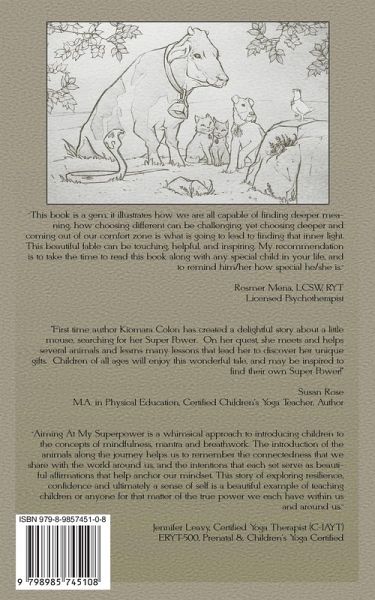 A delightful story about a little mouse, searching for her Superpower. On her quest, she meets and helps several animals and learns many lessons that lead her to discover her unique gifts. Children of all ages will enjoy this wonderful tale, and may be inspired to find their own Superpower!"
