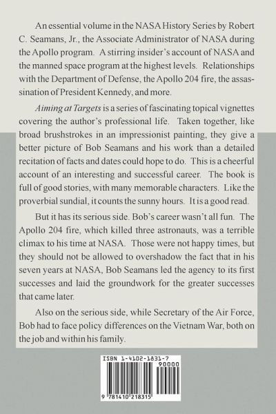 An essential volume in the NASA History Series by Robert C. Seamans, Jr., the Associate Administrator of NASA during the Apollo program. A stirring insider's account of NASA and the manned space program at the highest levels. Relationships with the Department of Defense, the Apollo 204 fire, the assassination of President Kennedy, and more. Aiming at Targets is a series of fascinating topical vignettes covering the author's professional life. Taken together, like broad brushstrokes in an impressionist painting, they give a better picture of Bob Seamans and his work than a detailed recitation of facts and dates could hope to do. This is a cheerful account of an interesting and successful career. The book is full of good stories, with many memorable characters. Like the proverbial sundial, it counts the sunny hours. It is a good read. But it has its serious side. Bob's career wasn't all fun. The Apollo 204 fire, which killed three astronauts, was a terrible climax to his time at NASA. Those were not happy times, but they should not be allowed to overshadow the fact that in his seven years at NASA, Bob Seamans led the agency to its first successes and laid the groundwork for the greater successes that came later. Also on the serious side, while Secretary of the Air Force, Bob had to face policy differences on the Vietnam War, both on the job and within his family.