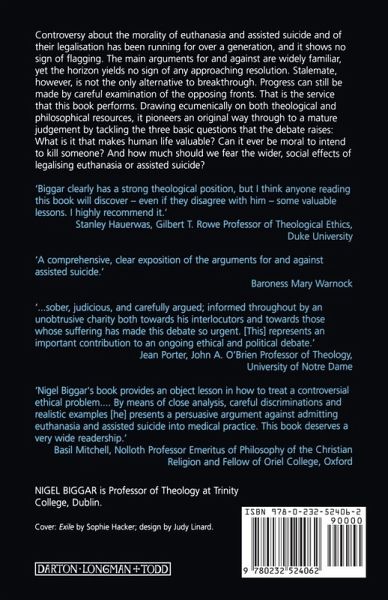 Controversy about the morality of euthanasia and assisted suicide has been running for over a generation. The servise this book performs is making a careful examination of the opposing fronts and drawing ecumenically on both theological and philosophical resouces and pioneers an original way through to a mature judgement by tackling three basic questions: What makeshuman life valuable? Can it ever be moral to intend to kill someone? How much should we fear the wider, social effects of legalising euthanasia or assisted suicide?