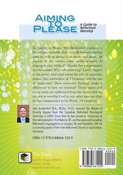 In Aiming to Please, Wes Bredenhof explains in his unique, readable style, how Reformed worship aims to help us please God more and more. All aspects of the service come under scrutiny: Is singing hymns biblical? Should the congregation say the votum? Why collection bags? Lord's Supper in the pews? And what about the role of organists, drums, the celebration of Christmas, and the use of projectors? Does covenant theology make a difference to how we worship? These topics and many more are addressed from the stance that we are not to worship God in any other manner than he has commanded in his Word.