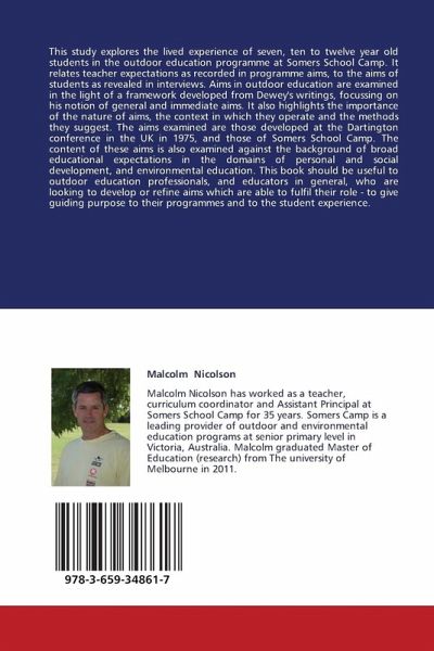 This study explores the lived experience of seven, ten to twelve year old students in the outdoor education programme at Somers School Camp. It relates teacher expectations as recorded in programme aims, to the aims of students as revealed in interviews. Aims in outdoor education are examined in the light of a framework developed from Dewey's writings, focussing on his notion of general and immediate aims. It also highlights the importance of the nature of aims, the context in which they operate and the methods they suggest. The aims examined are those developed at the Dartington conference in the UK in 1975, and those of Somers School Camp. The content of these aims is also examined against the background of broad educational expectations in the domains of personal and social development, and environmental education. This book should be useful to outdoor education professionals, and educators in general, who are looking to develop or refine aims which are able to fulfil their role - to give guiding purpose to their programmes and to the student experience.