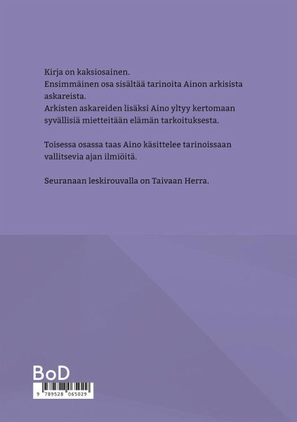 Kirja on kaksiosainen. Ensimmäinen osa sisältää tarinoita Ainon arkisista askareista. Arkisten askareiden lisäksi Aino yltyy kertomaan syvällisiä mietteitään elämän tarkoituksesta. Toisessa osassa taas Aino käsittelee tarinoissaan vallitsevia ajan ilmiöitä. Seuranaan leskirouvalla on Taivaan Herra.