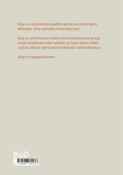 Kirja on runomittaan laadittu kertomus erään tytön elämästä aina vanhaksi mummoksi asti. Kirja on perhetarina. Kolme ensimmäistä lasta syntyy toisen maailmansodan aikoihin ja loput kolme sitten rauhan aikana isänmaata innokkaasti rakennettaessa. Kirja on helppolukuinen.
