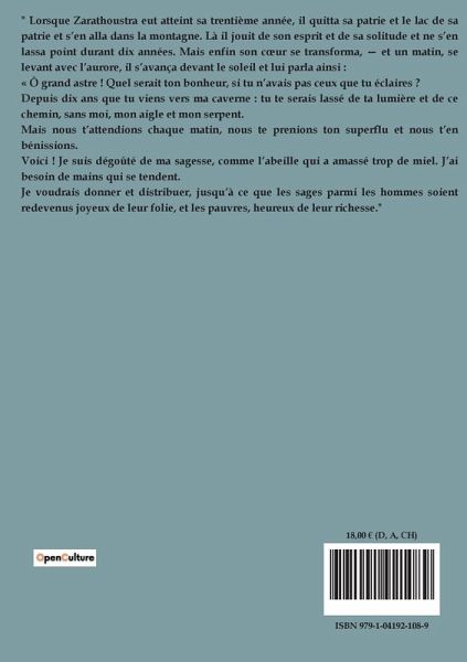 " Lorsque Zarathoustra eut atteint sa trentième année, il quitta sa patrie et le lac de sa patrie et s¿en alla dans la montagne. Là il jouit de son esprit et de sa solitude et ne s¿en lassa point durant dix années. Mais enfin son c¿ur se transforma, ¿ et un matin, se levant avec l¿aurore, il s¿avança devant le soleil et lui parla ainsi : « Ô grand astre ! Quel serait ton bonheur, si tu n¿avais pas ceux que tu éclaires ? Depuis dix ans que tu viens vers ma caverne : tu te serais lassé de ta lumière et de ce chemin, sans moi, mon aigle et mon serpent. Mais nous t¿attendions chaque matin, nous te prenions ton superflu et nous t¿en bénissions. Voici ! Je suis dégoûté de ma sagesse, comme l¿abeille qui a amassé trop de miel. J¿ai besoin de mains qui se tendent. Je voudrais donner et distribuer, jusqüà ce que les sages parmi les hommes soient redevenus joyeux de leur folie, et les pauvres, heureux de leur richesse."
