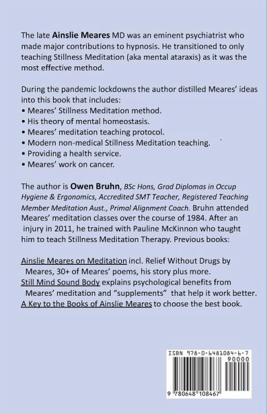 The late Ainslie Meares, MD DPM was an eminent Australian psychiatrist who made major contributions to hypnosis. Meares transitioned to teaching Stillness Meditation as it was the most effective method. During the pandemic, locked down with Meares' 36 books and journal articles, the author distilled Meares' teaching ideas into one book:Meares' Stillness Meditation method. His theory of mental homeostasis. Meares' complete teaching protocol. Adjustments and additional guidance for modern non-medical Stillness Meditation teaching. Stillness Meditation Teaching inside a health service framework. Meares' work on Stillness Meditation and cancer. The author is Owen Bruhn, BSc Hons, Grad Diplomas in Occup Hygiene and Ergonomics, Accredited SMT Teacher, Member Meditation Australia, Primal Blueprint and Posture Alignment coach. Bruhn met Dr Meares in 1984 and attended his meditation classes over the course of that year. He trained much later, with Pauline McKinnon, who taught him to teach Meares' method, after an injury in 2011. His previous books:- Ainslie Meares on Meditation, explains how to meditate, has 30+ of his poems, his life story plus more. A Key to the Books of Ainslie Meares, helps choose the right book, first time around. Still Mind Sound Body, explains psychological changes resulting from Meares' meditation, support factors (sleep etc), actions for better living and more www.mearesbook.com.au