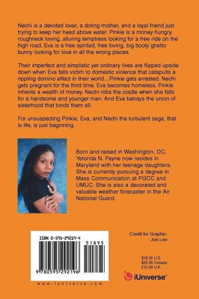 Nechi is a devoted lover, a doting mother, and a loyal friend just trying to keep her head above water. Pinkie is a money hungry, roughneck loving, alluring temptress looking for a free ride on the high road. Eva is a free spirited, free loving, big booty ghetto bunny looking for love in all the wrong places. Their imperfect and simplistic yet ordinary lives are flipped upside down when Eva falls victim to domestic violence that catapults a rippling domino effect in their world...Pinkie gets arrested. Nechi gets pregnant for the third time. Eva becomes homeless. Pinkie inherits a wealth of money. Nechi robs the cradle when she falls for a handsome and younger man. And Eva betrays the union of sisterhood that binds them all. For unsuspecting Pinkie, Eva, and Nechi the turbulent saga, that is life, is just beginning.