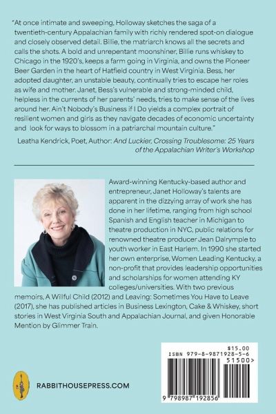 Questions of identity and abandonment haunt the linked stories that make up Janet Holloway's Ain't Nobody's Business If I Do. In writing at once intimate and sweeping, Holloway sketches the saga of a twentieth-century Appalachian family. At the book's heart lie three generations of women, richly rendered in Holloway's spot-on dialogue and closely observed detail. Billie, the matriarch, knows all the secrets and calls the shots, as she capably runs a string of businesses across several states. A bold and unrepentant moonshiner, Billie runs whiskey to Chicago in the 1920s (for which she eventually serves jail time), keeps a farm going in Virginia, and owns the Pioneer Beer Garden in the heart of Hatfield country in West Virginia. Bess, her adopted daughter, an unstable beauty unsure of who she is, continually tries to escape her roles as wife and mother. And Janet, Bess's child, helpless in the currents of her parents' needs, tries to make sense of the lives around her. Both vulnerable and strong-minded, she finds her anchor in Billie's "unrestrained yet tough love." This highly readable collection yields a complex portrait of resilient women and girls as they navigate decades of economic uncertainty and look for ways to blossom in a patriarchal mountain culture. - Leatha Kendrick, Poet, Author, And Luckier, Second Opinion