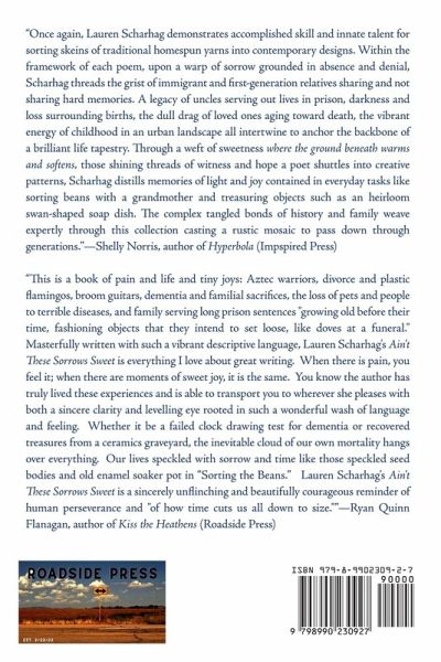 Cover Art by Beth Barnett. These 64 poems are divided into two sections, Sorrows and Sweetness. These poems are very personal and intimate, yet firmly grounded in the real world. They cover such topics as Latine culture, family, feminism, home, memory, health, food, and cats. Overall, this book is a celebration of life in both grief and joy. Lauren Scharhag (she/her) is a queer, disabled author of Latine descent, and a senior editor at Gleam. To date, her work includes poetry, horror, science-fiction, fantasy, children's books, and literary fiction. She hopes to add to the list. She is extensively published in literary venues around the world. Recent honors include: 2023 Rhysling Award Finalist, 2022 SFFP Speculative Poetry Contest (Honorable Mention), 2021 Stephen A. DiBiase Poetry Contest (Finalist), and the 2019 Seamus Burns Creative Writing Prize (Winner). Her work has also received multiple Best of the Net, Pushcart Prize, and Rhysling Award nominations. A poetry collection, Moonlight and Monsters, is now available from Gnashing Teeth Publishing. A short story collection, Screaming Intensifies, is forthcoming from Whiskey City Press. She lives in Kansas City, MO. https://linktr.ee/laurenscharhag "Once again, Lauren Scharhag demonstrates accomplished skill and innate talent for sorting skeins of traditional homespun yarns into contemporary designs. Within the framework of each poem, upon a warp of sorrow grounded in absence and denial, Scharhag threads the grist of immigrant and first-generation relatives sharing and not sharing hard memories. A legacy of uncles serving out lives in prison, darkness and loss surrounding births, the dull drag of loved ones aging toward death, the vibrant energy of childhood in an urban landscape all intertwine to anchor the backbone of a brilliant life tapestry. Through a weft of sweetness where the ground beneath warms and softens, those shining threads of witness and hope a poet shuttles into creative patterns, Scharhag distills memories of light and joy contained in everyday tasks like sorting beans with a grandmother and treasuring objects such as an heirloom swan-shaped soap dish. The complex tangled bonds of history and family weave expertly through this collection casting a rustic mosaic to pass down through generations."-Shelly Norris, author of Hyperbola (Impspired Press) "This is a book of pain and life and tiny joys: Aztec warriors, divorce and plastic flamingos, broom guitars, dementia and familial sacrifices, the loss of pets and people to terrible diseases, and family serving long prison sentences "growing old before their time, fashioning objects that they intend to set loose, like doves at a funeral." Masterfully written with such a vibrant descriptive language, Lauren Scharhag's Ain't These Sorrows Sweet is everything I love about great writing. When there is pain, you feel it; when there are moments of sweet joy, it is the same. You know the author has truly lived these experiences and is able to transport you to wherever she pleases with both a sincere clarity and levelling eye rooted in such a wonderful wash of language and feeling. Whether it be a failed clock drawing test for dementia or recovered treasures from a ceramics graveyard, the inevitable cloud of our own mortality hangs over everything. Our lives speckled with sorrow and time like those speckled seed bodies and old enamel soaker pot in "Sorting the Beans." Lauren Scharhag's Ain't These Sorrows Sweet is a sincerely unflinching and beautifully courageous reminder of human perseverance and "of how time cuts us all down to size.""-Ryan Quinn Flanagan, author of Kiss the Heathens (Roadside Press)